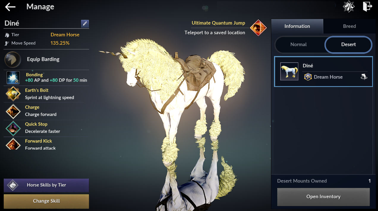 Ou seja, a velocidade de Diné é muito superior em relação às opções atuais como elefante e camelo. Jogadores podem usar o Salto Quântico para se teletransportarem ao interagirem com uma Black Rock Shrine no deserto.